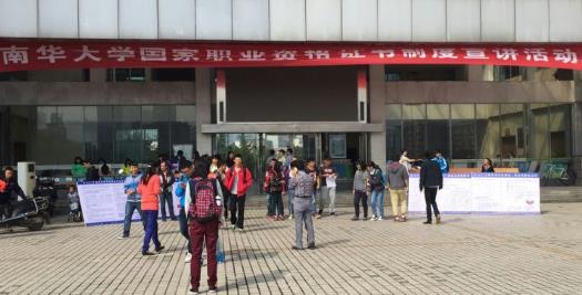 为大力推行国家职业资格证书制度,加快技能人才队伍建设,更好地服务我校学生就业和经济社会发展,贯彻执行湖南省人力资源和社会保障厅职业技能鉴定中心下发的《华体会平台,华体会(中国)开展2015年国家职业资格证书制度宣讲活动的通知》(湘人社鉴函〔2015〕5号)文件,2015年10月11日上午继续教育学院在南华大学第1教学楼前坪举办了国家职业资格证书制度宣讲活动。活动通过在校园布置宣传横幅、摆放展架、发放相关宣传资料、现场问卷调查方式进行,让学生更多的了解了国家职业资格制度。